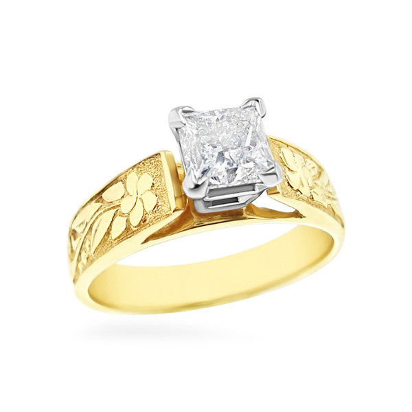 The Plumeria Grande French Mount features a graceful raised plumeria scroll design and can be customized with your choice of diamond. Its wider 6mm band makes it especially well suited for stones 1/3 carat and larger.