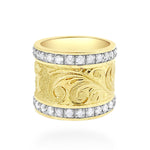 The Diamond Kalākaua Ring is a striking statement piece featuring a bold flat profile and hand engraved Queen scroll design. Crafted in an extra heavy weight and customizable with a name, it is a distinguished ring that blends personal meaning with timeless Hawaiian style.